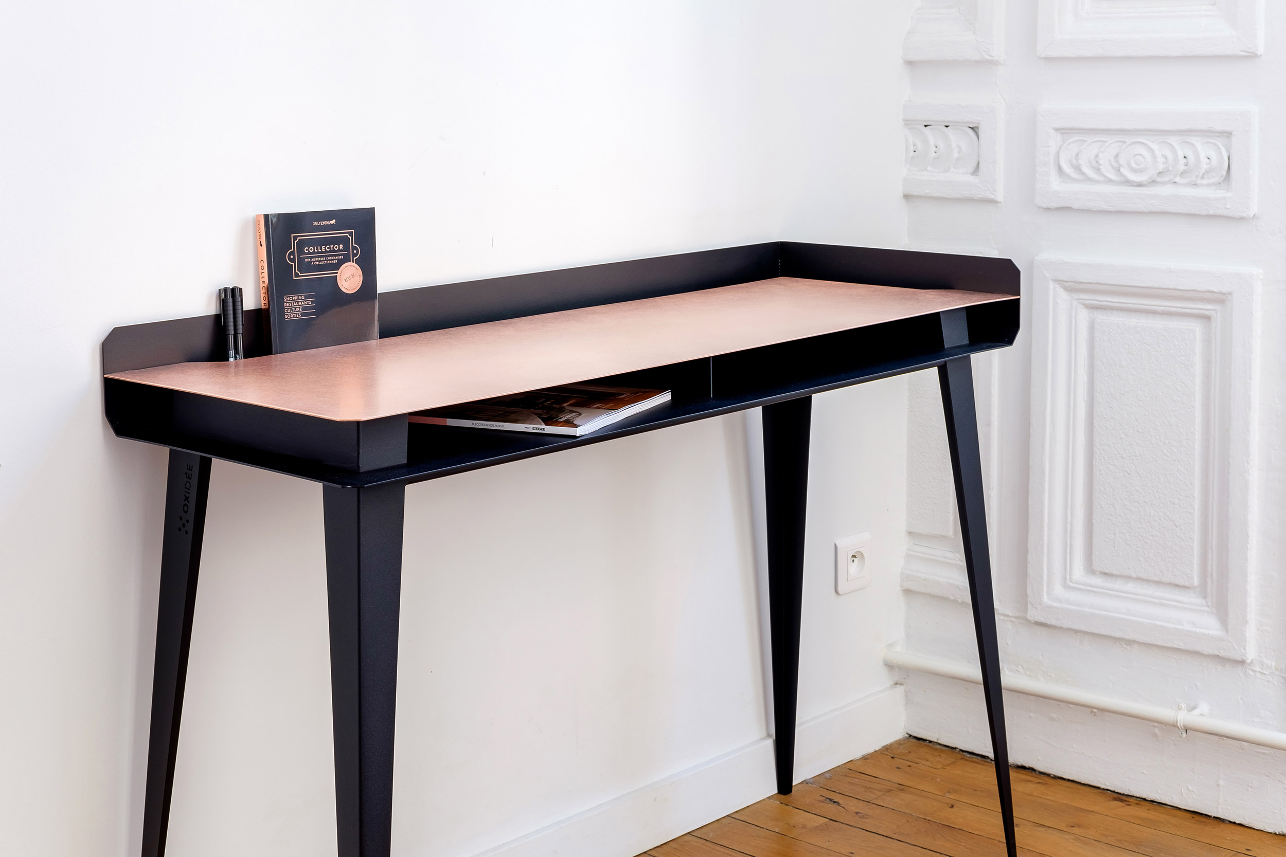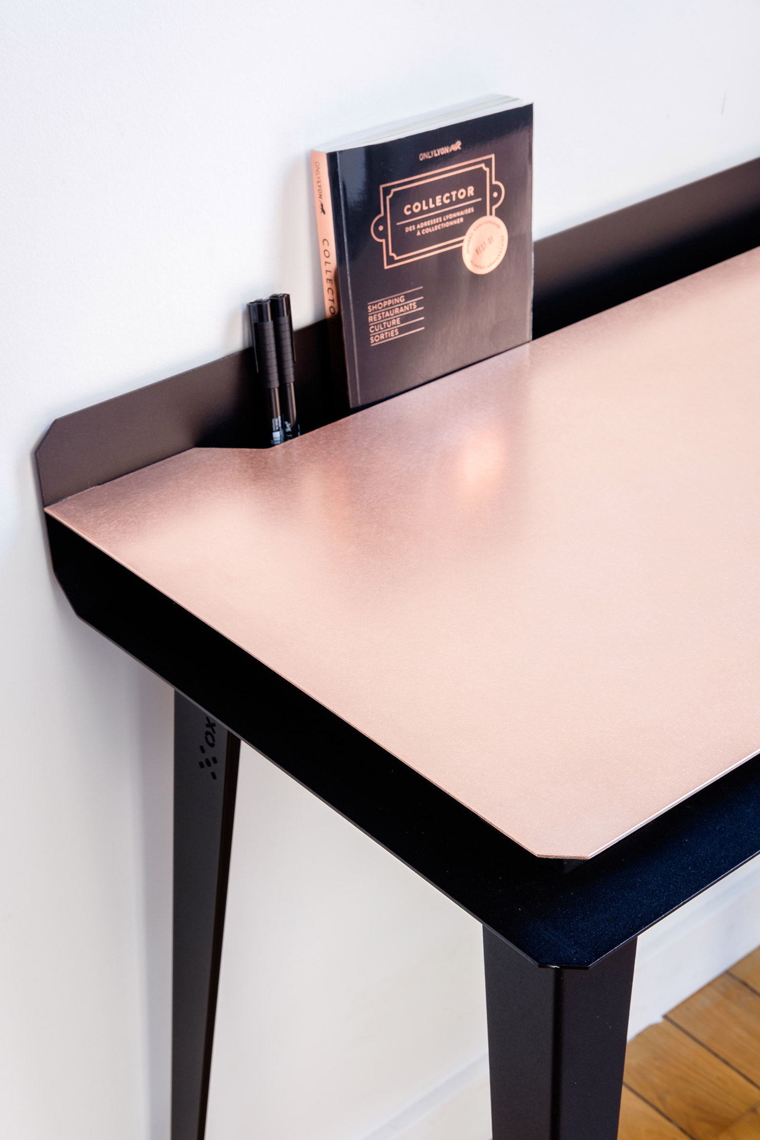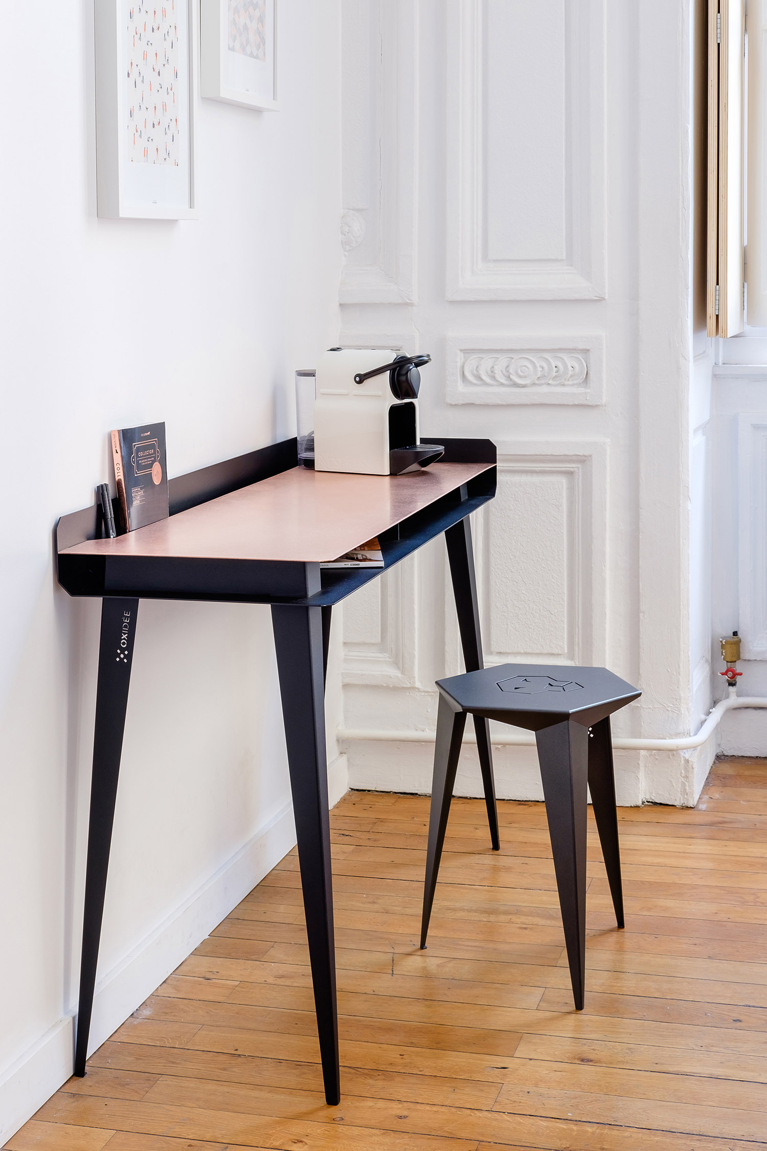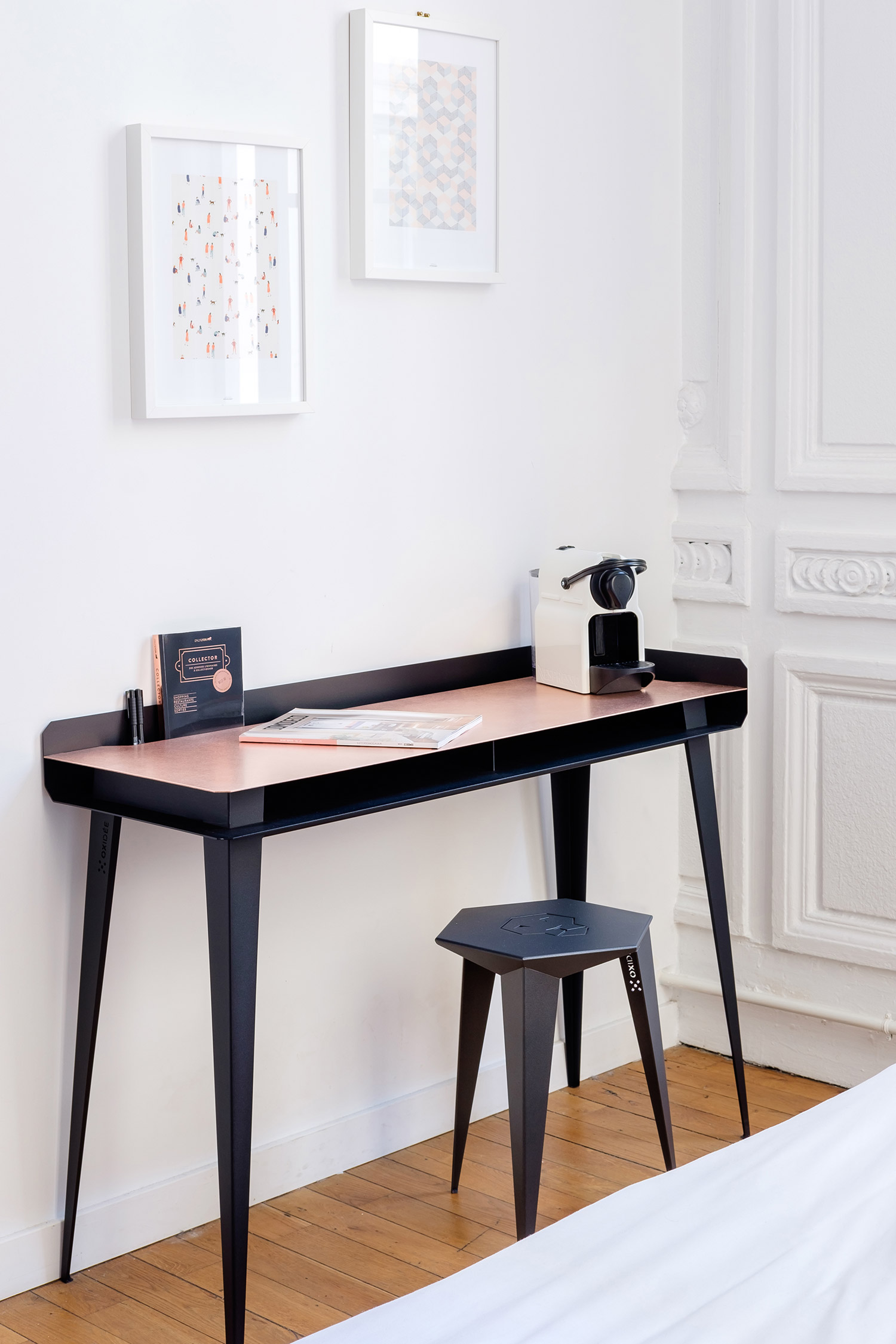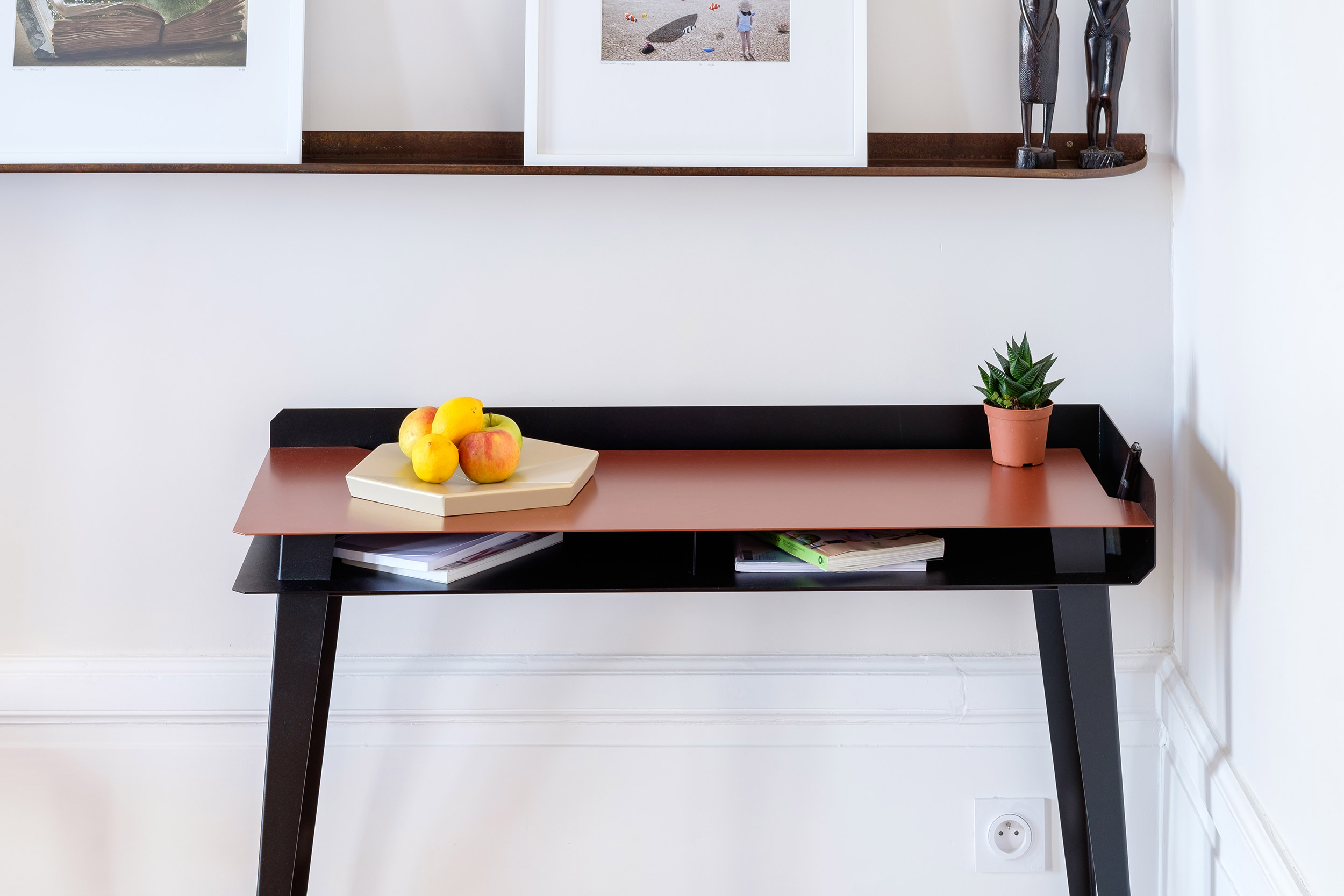 Réalisée en collaboration avec le designer Jérôme Pantalacci, la console Célestins se distingue par son élégance et sa légèreté, obtenues grâce à l’utilisation de tôle aux chants apparents. Pensée comme un meuble de bureau sur mesure, elle propose des espaces de rangement astucieusement intégrés sous et autour du plateau, alliant praticité et esthétisme.