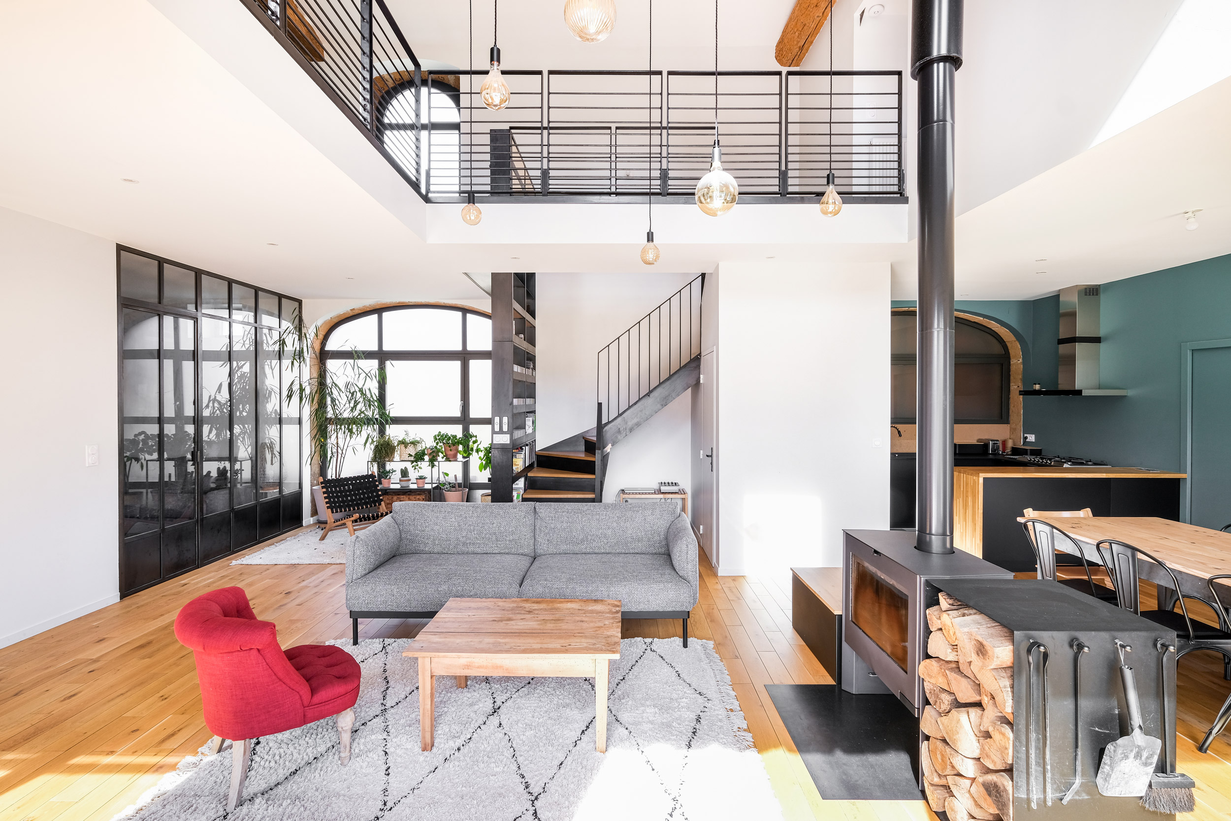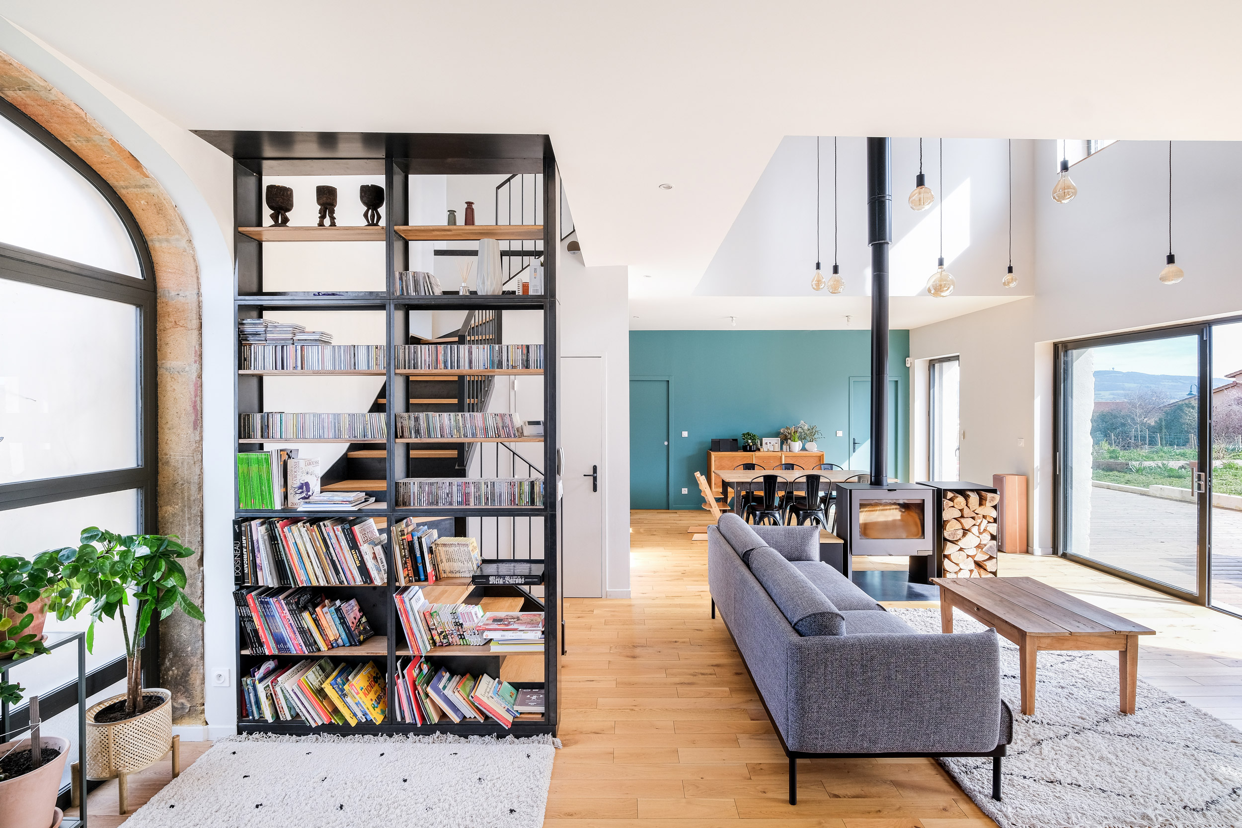 Cet escalier deux quarts tournants au style industriel revisité est une réalisation unique imaginée et fabriquée dans le Beaujolais. Conçu par Ox-idée pour allier esthétisme et fonctionnalité, cet escalier se distingue par sa bibliothèque intégrée montant jusqu’au premier étage, véritable colonne vertébrale de l’espace.