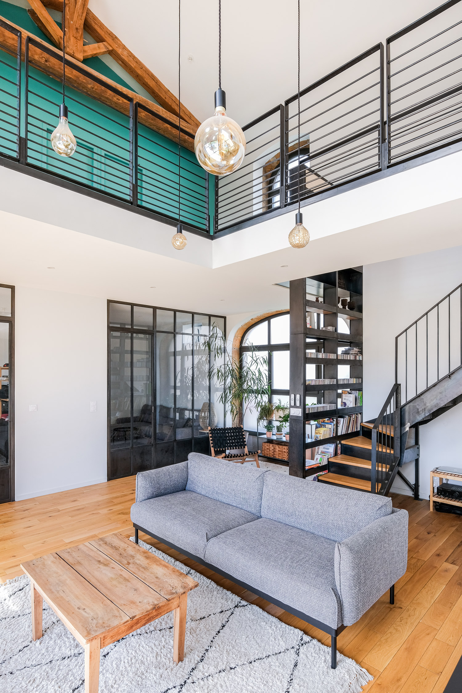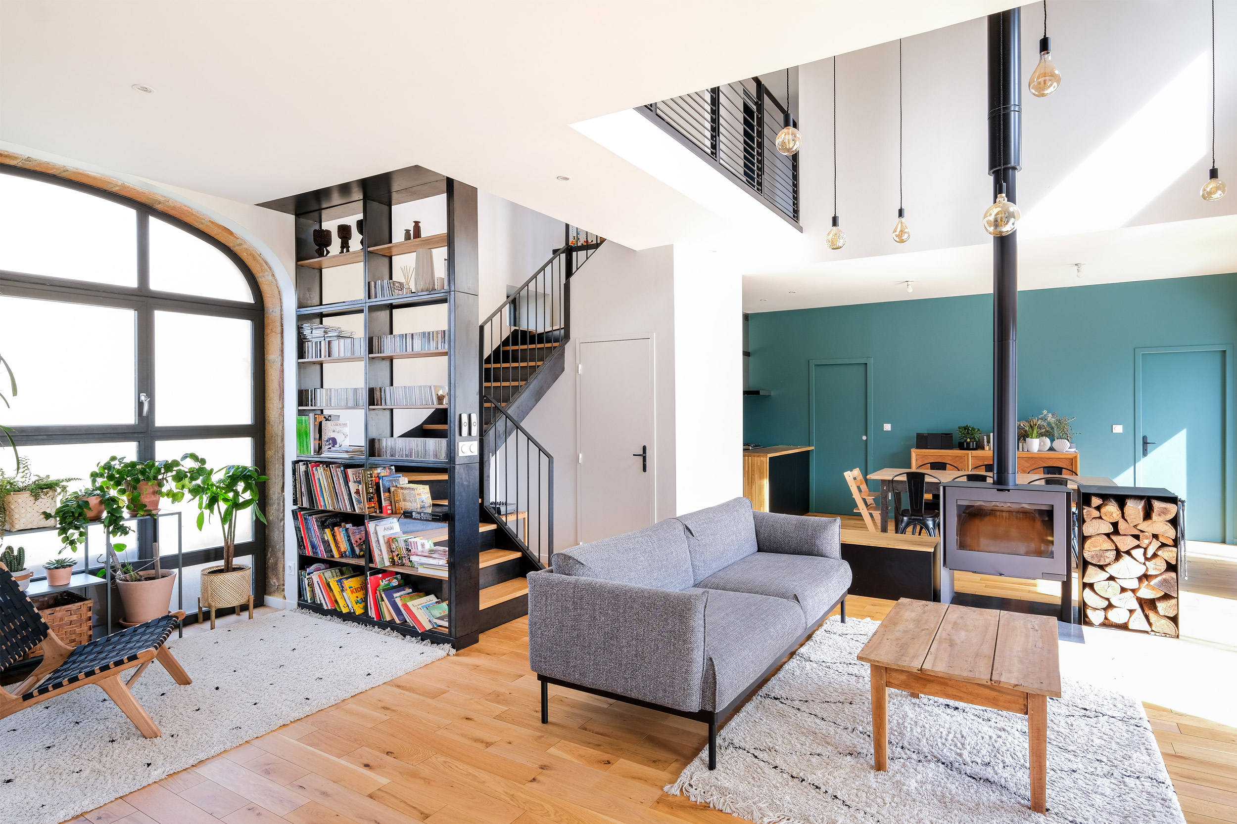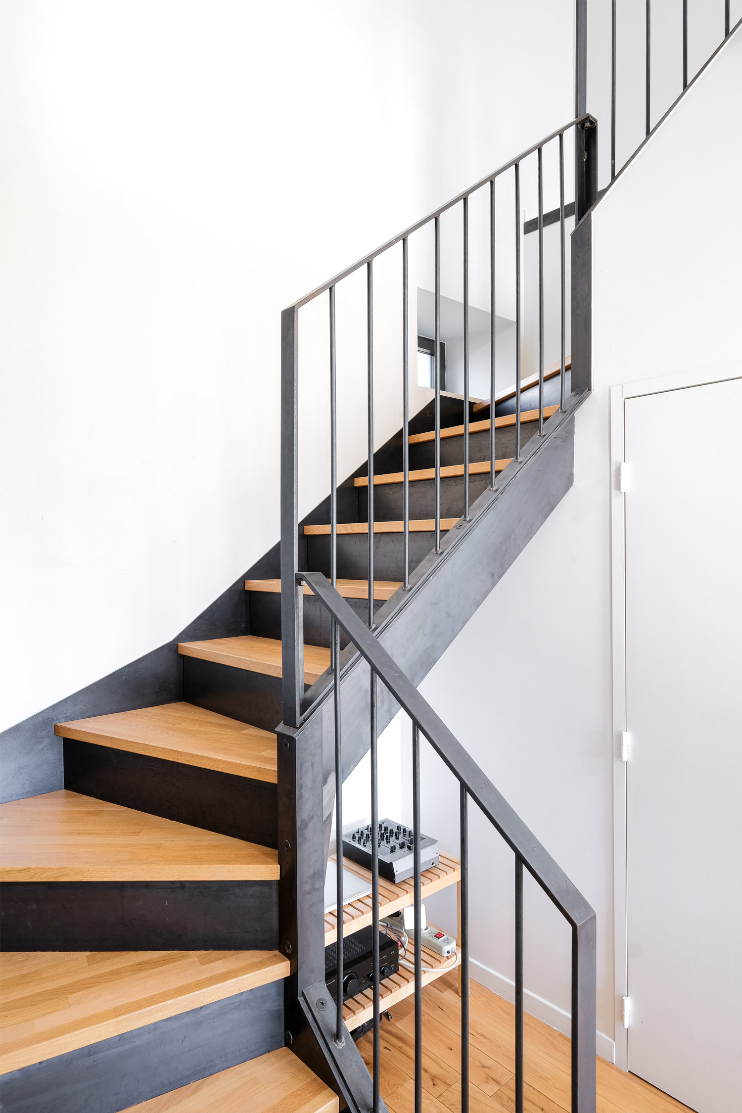 Les limons en acier brut calaminé apportent une touche authentique et industrielle, tandis que les marches en chêne vitrifié offrent chaleur et confort sous le pas. La bibliothèque en tôle pliée toute hauteur s’intègre harmonieusement à la structure, créant une continuité visuelle entre les niveaux.