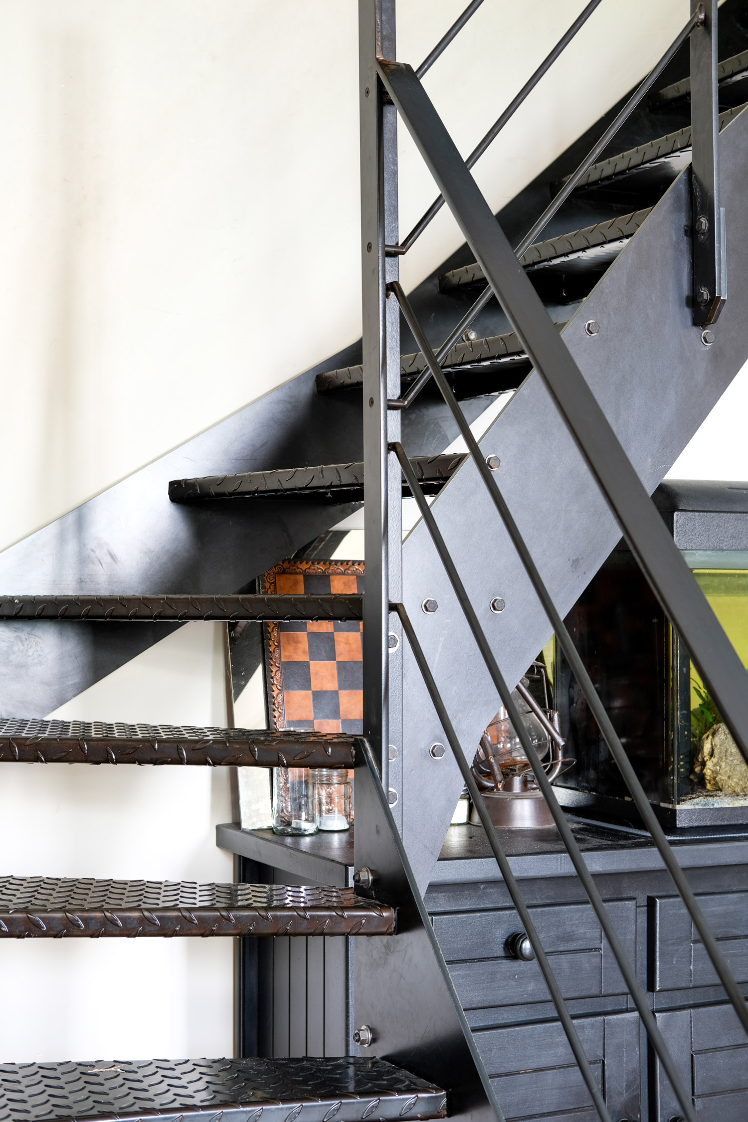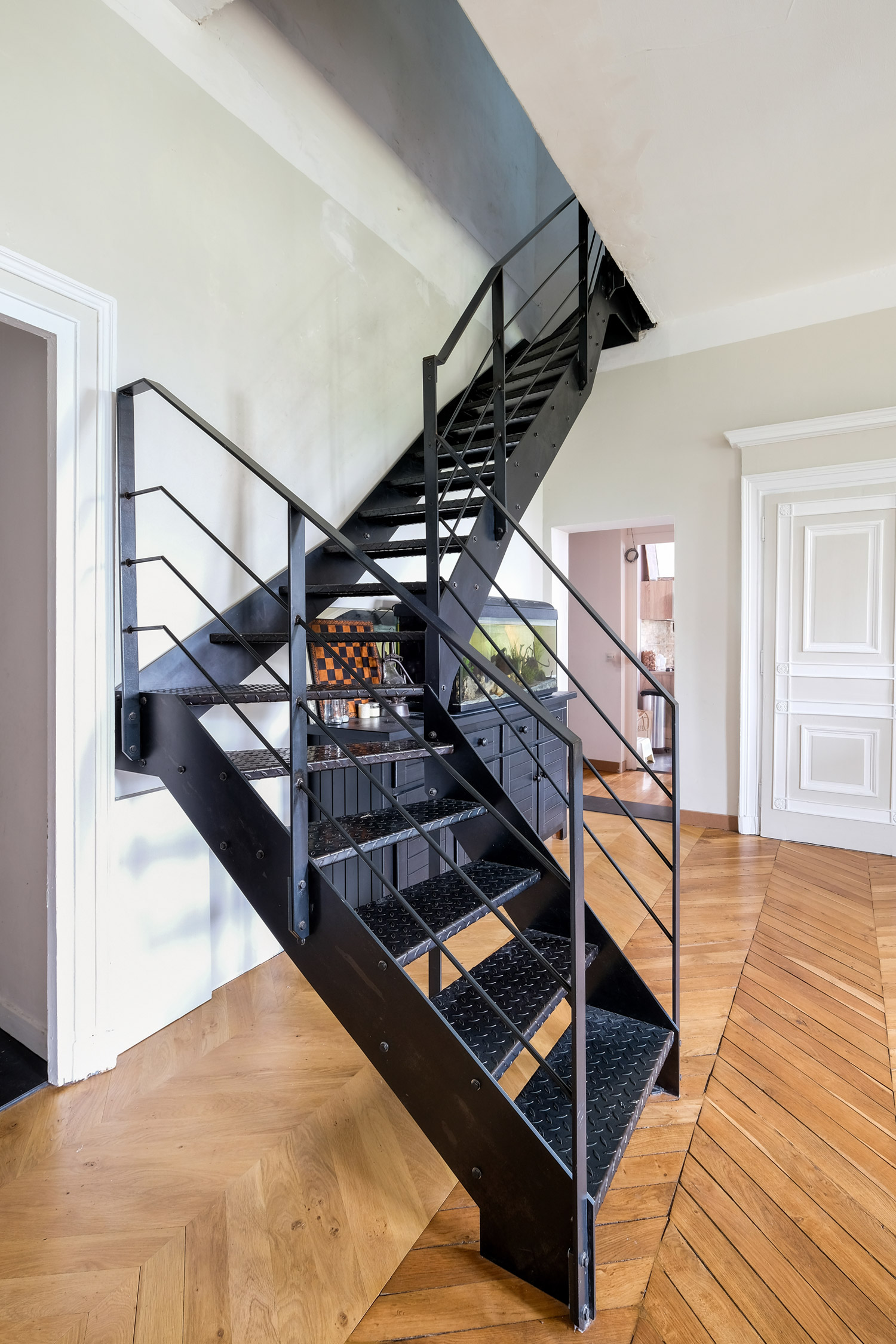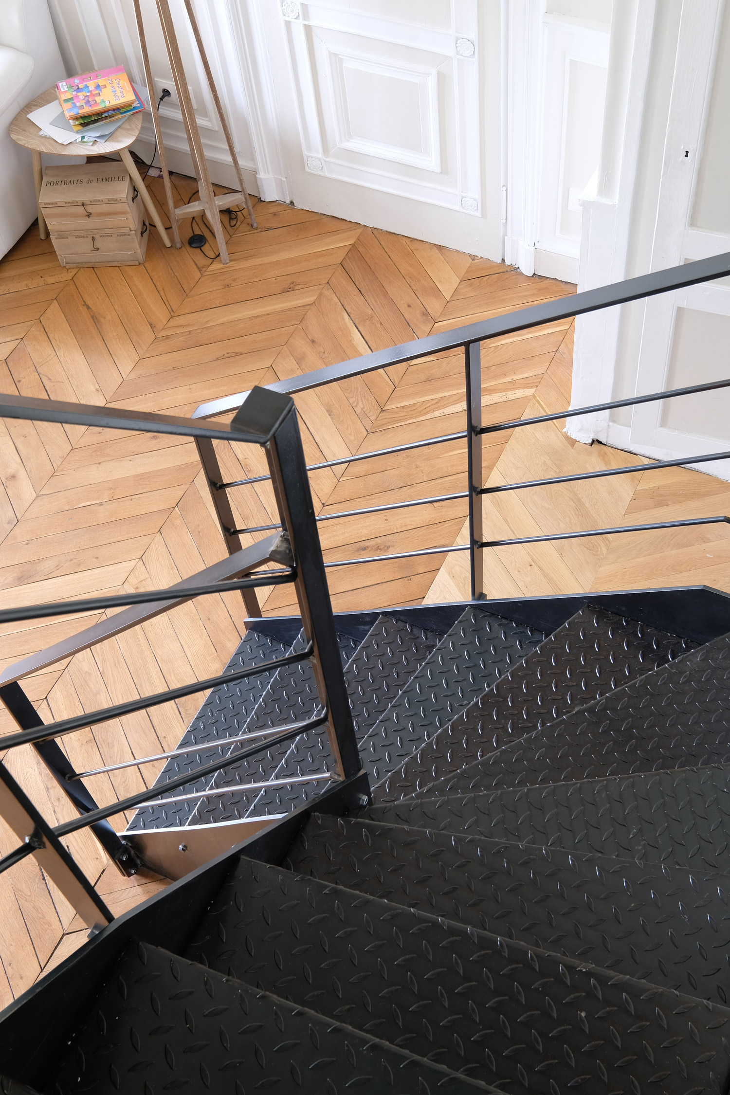 Le limon extérieur de cet escalier lyonnais accueille à la fois les gardes-corps et les marches, offrant une structure à la fois solide et élégante. Les marches en tôle larmée assurent une parfaite adhérence antidérapante, tout en renforçant le caractère industriel de l’ensemble.