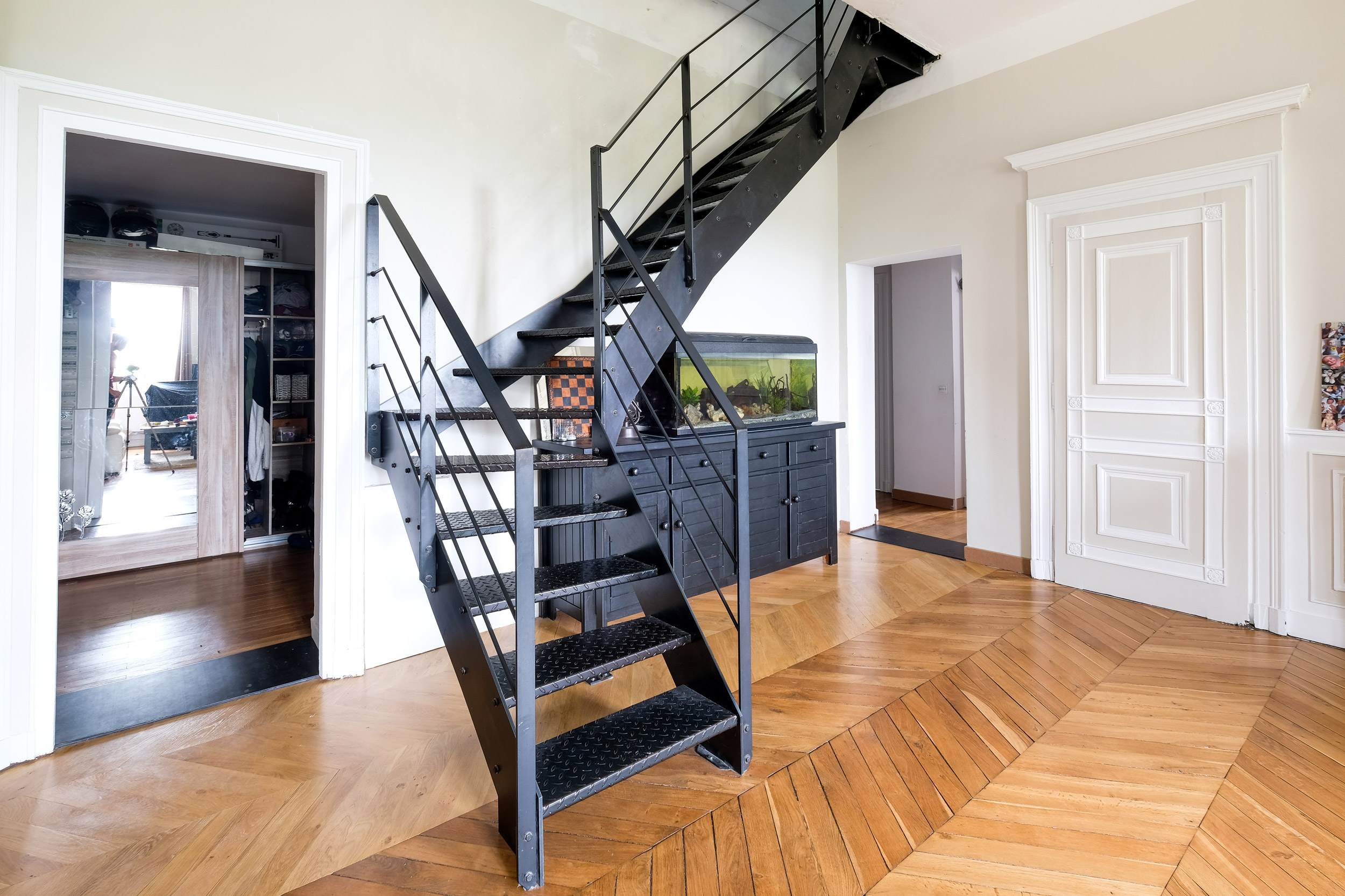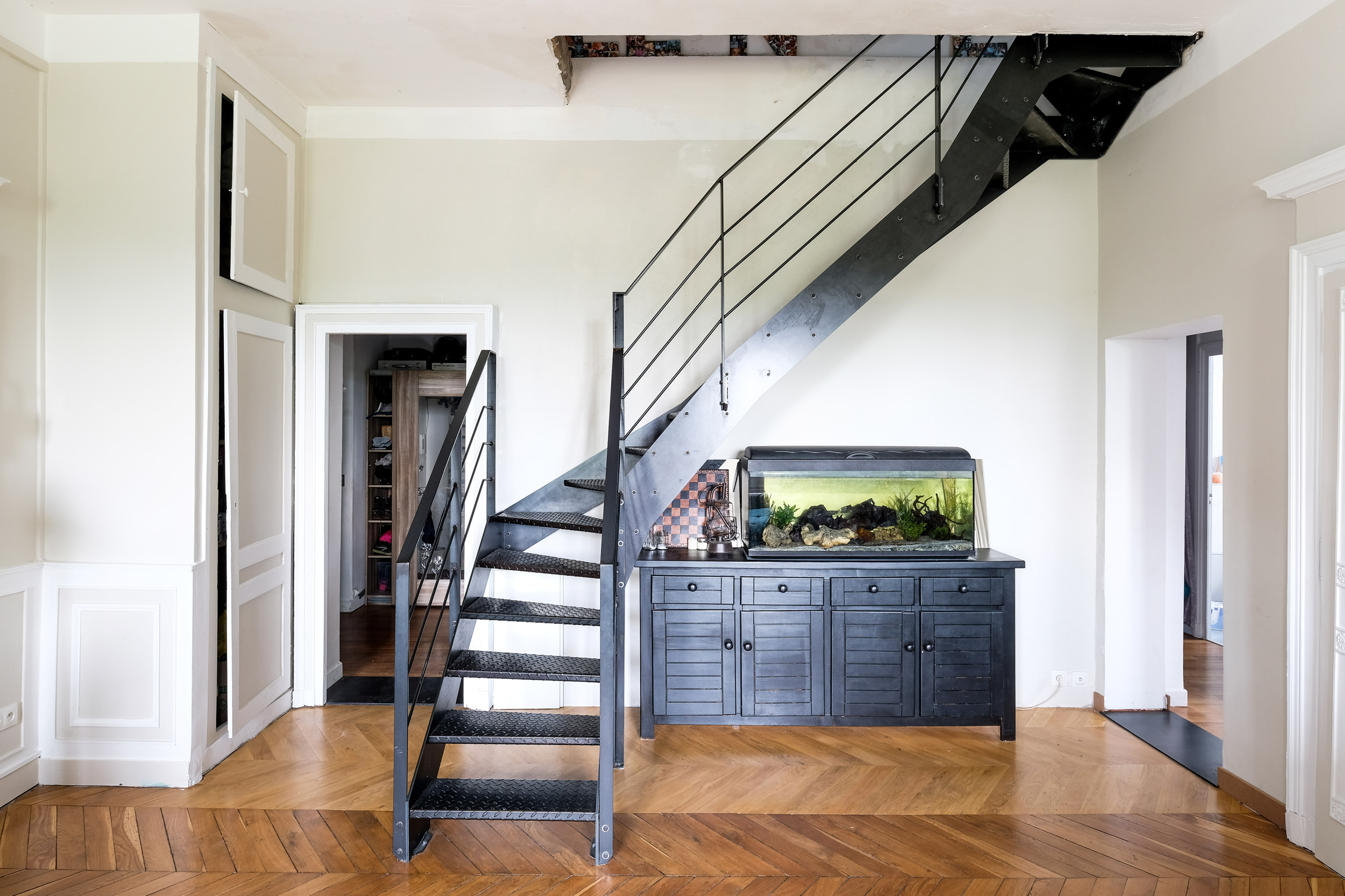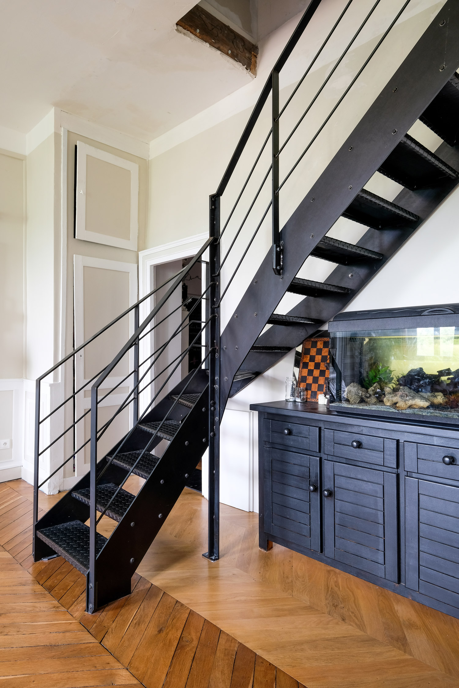 Le limon extérieur de cet escalier lyonnais accueille à la fois les gardes-corps et les marches, offrant une structure à la fois solide et élégante. Les marches en tôle larmée assurent une parfaite adhérence antidérapante, tout en renforçant le caractère industriel de l’ensemble.