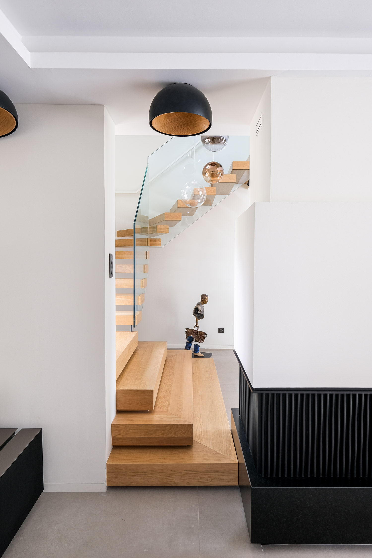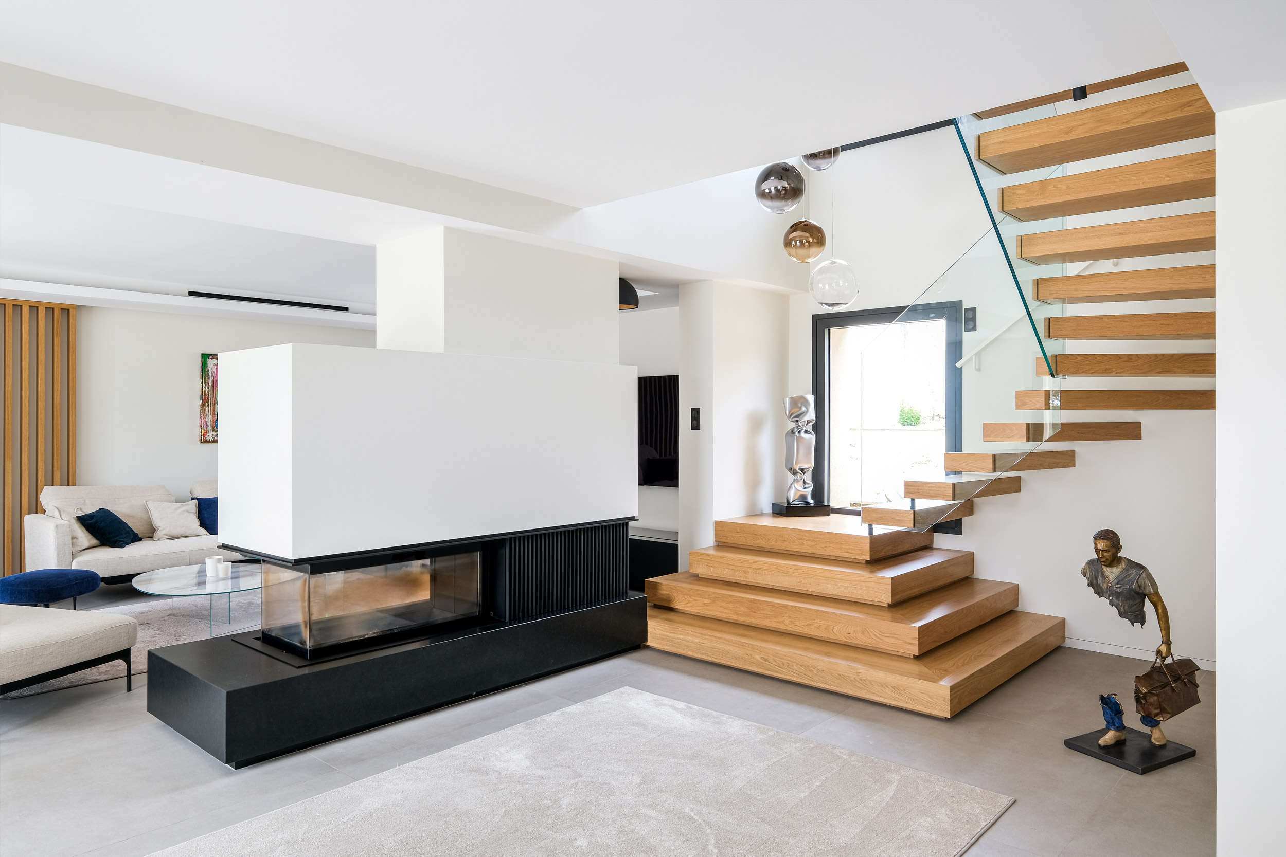 Les marches suspendues en chêne massif reposent sur une structure métallique porteuse entièrement dissimulée dans le mur, offrant une impression de légèreté et de fluidité. L’estrade de départ, réalisée elle aussi en chêne massif, s’intègre naturellement à l’espace et met en valeur la qualité du travail artisanal.