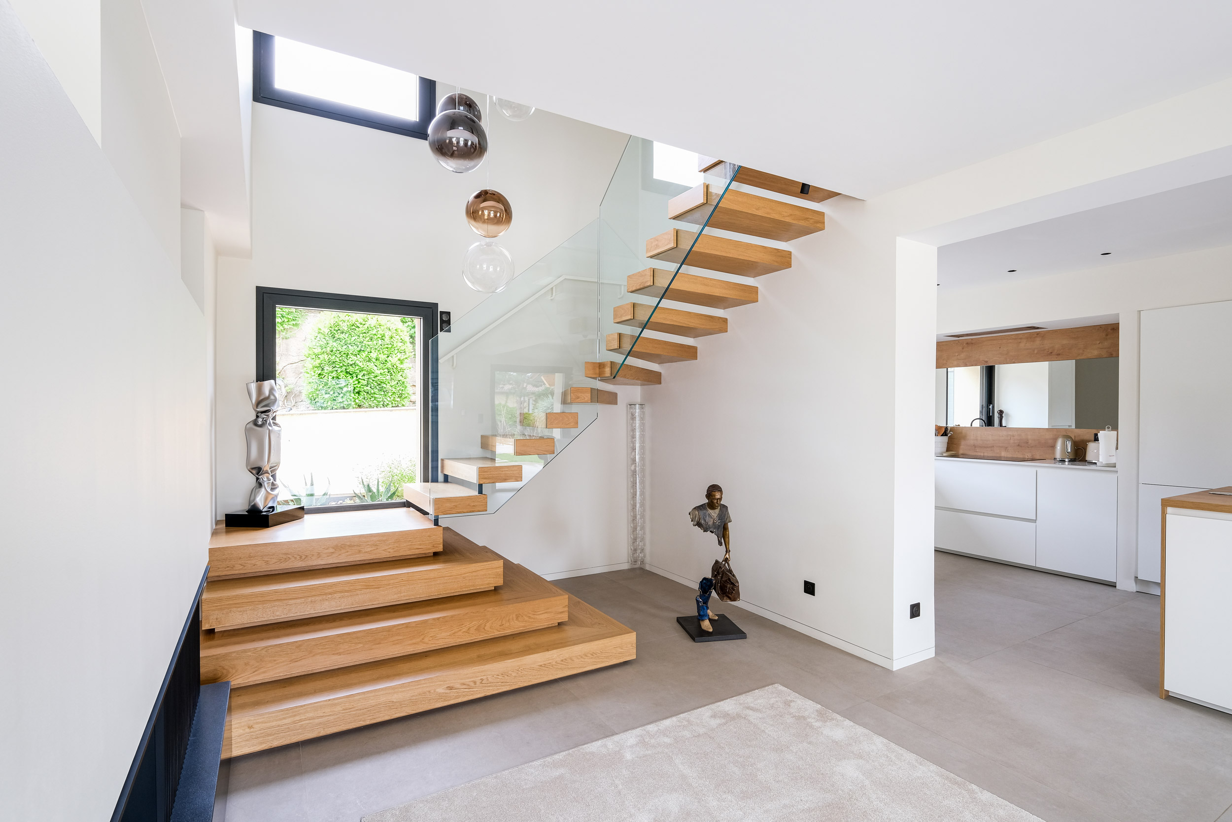 Cet escalier de Saint-Genis-Laval, imaginé et fabriqué dans la région de Lyon, illustre parfaitement l’équilibre entre design contemporain, savoir-faire métallier et harmonie des matériaux.