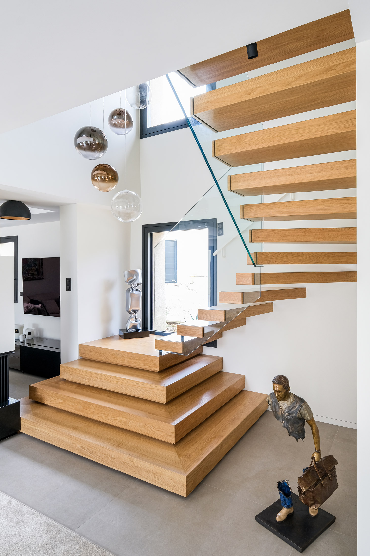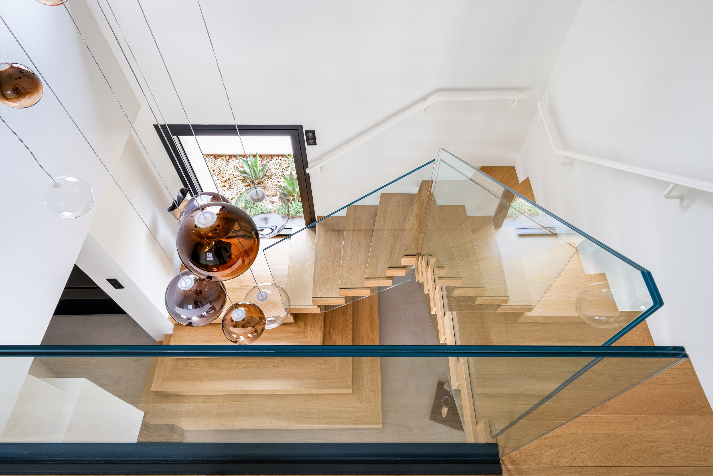 Le garde-corps vitré renforce la transparence de l’ensemble et laisse la lumière traverser librement l’escalier, soulignant la pureté des lignes et le soin apporté aux finitions.