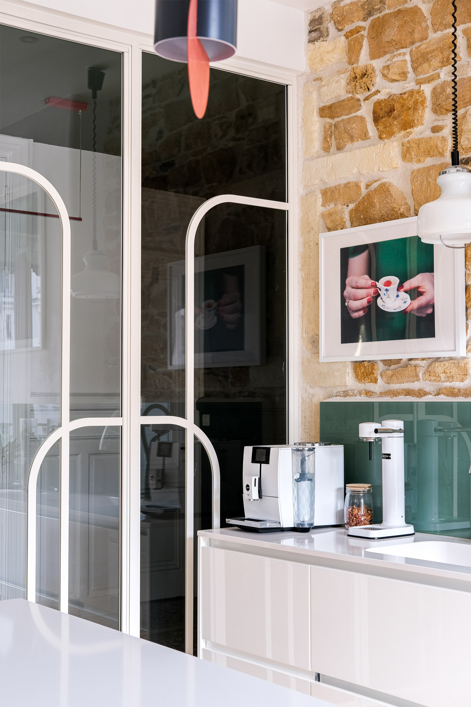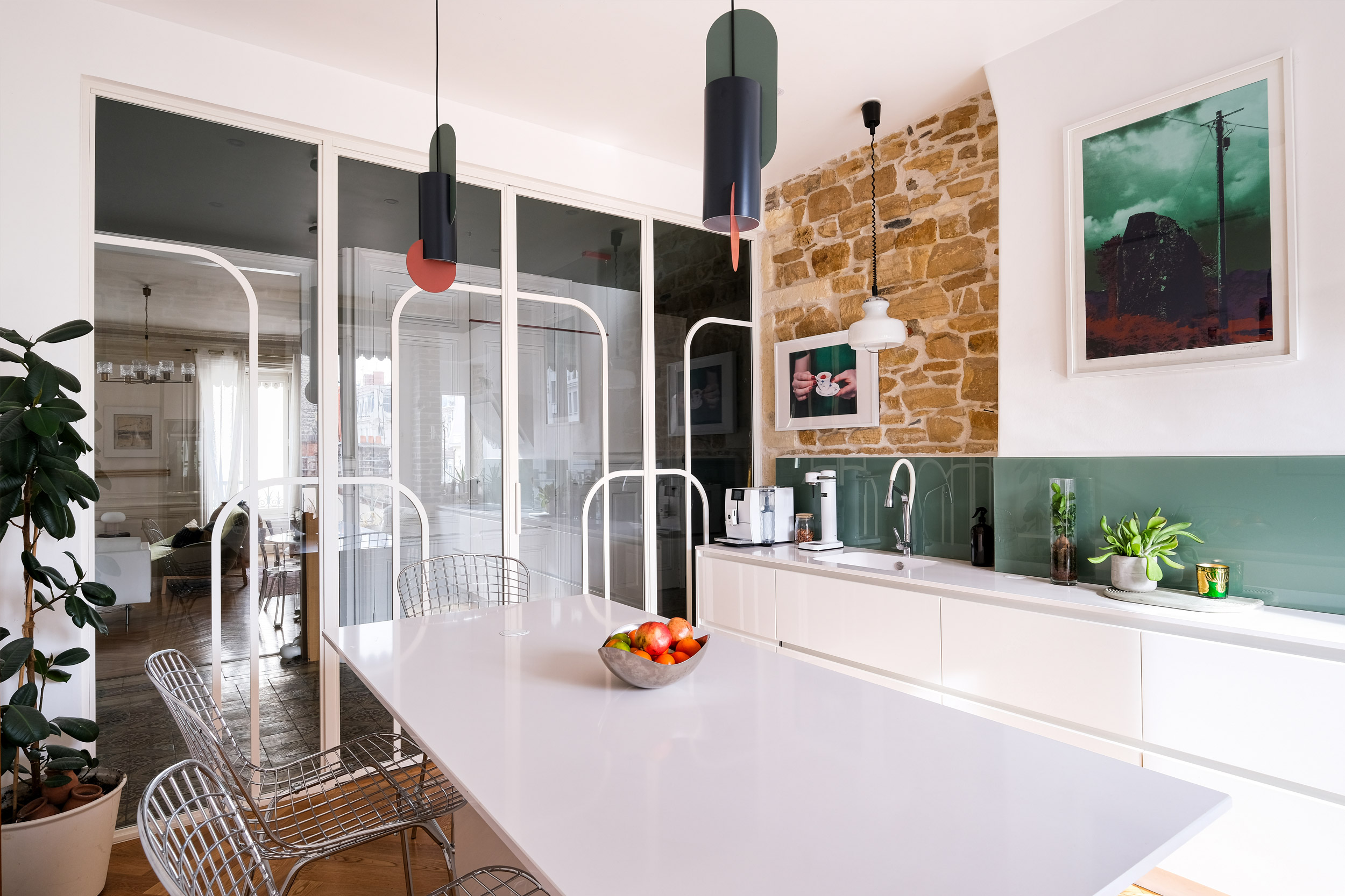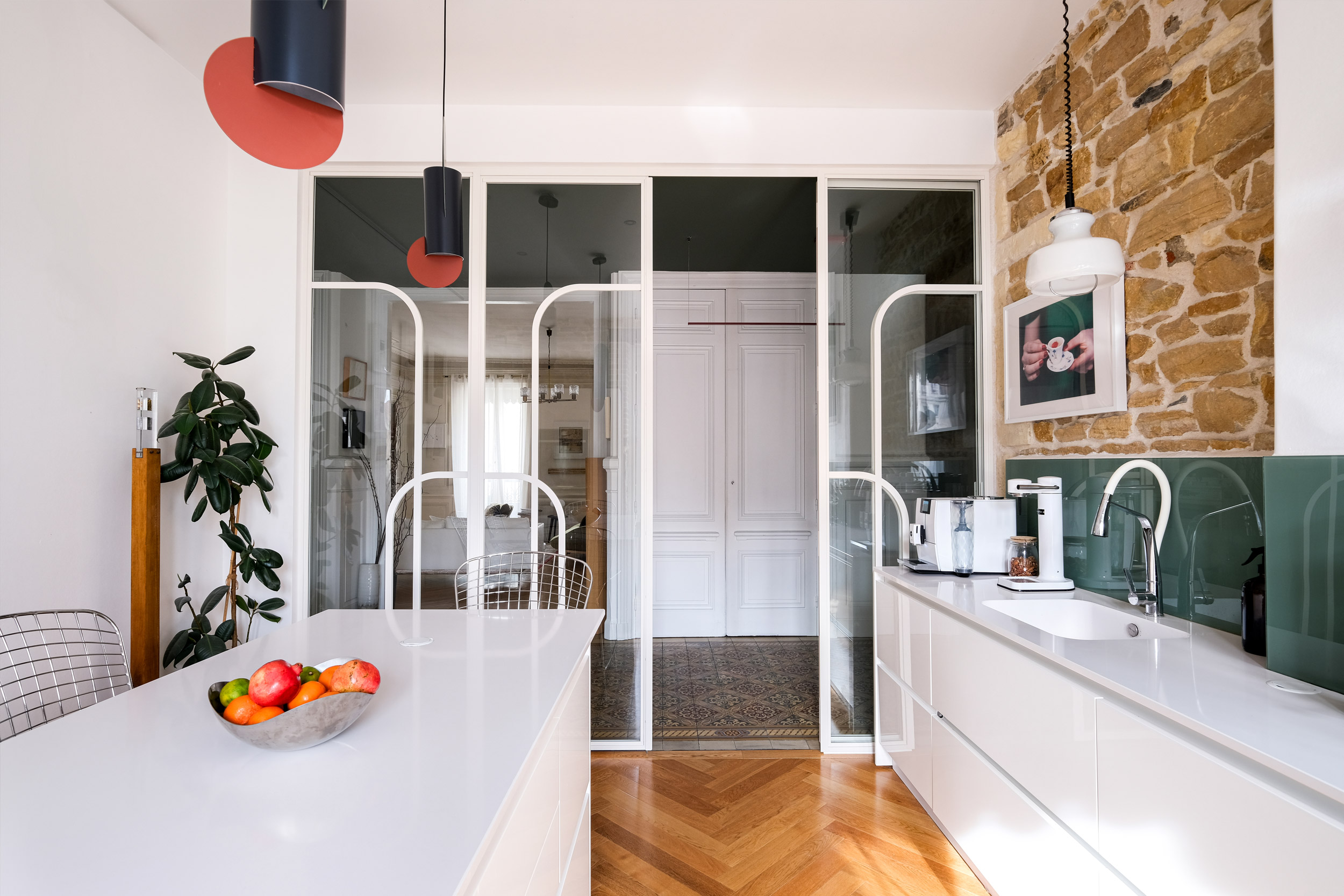 Dans un bel appartement haussmannien situé sur les quais du Rhône à Lyon 7ᵉ, Ox-idée a réalisé une verrière Art Déco sur mesure, pensée pour s’intégrer harmonieusement entre les pierres apparentes et le parquet à bâtons rompus de la cuisine, ainsi que les carreaux de ciment du couloir.
