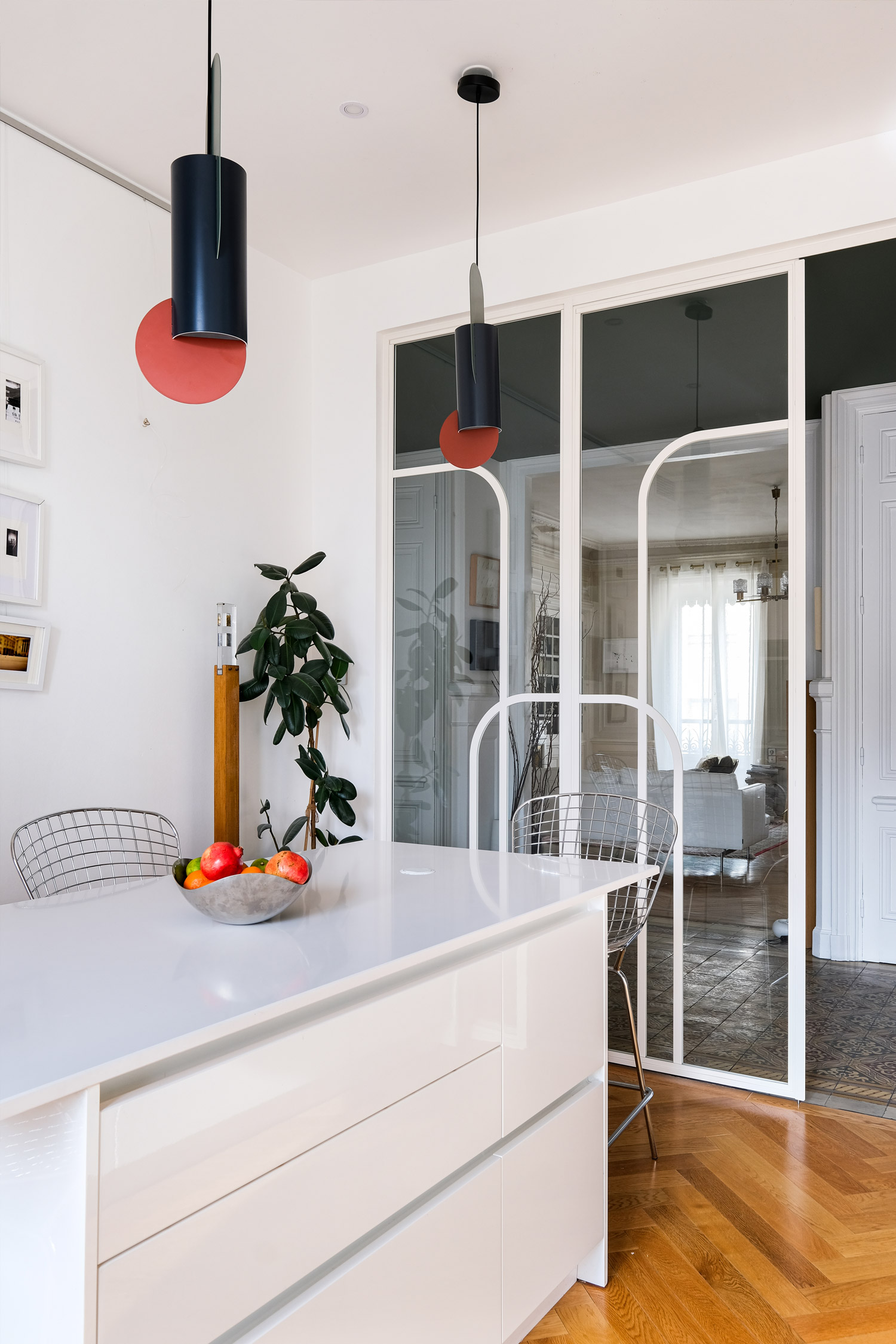 Cette verrière délimite l’espace de la cuisine tout en conservant l’ouverture et la lumière grâce à ses deux portes toutes hauteurs, capables de se rabattre à 180° sur les parties fixes extérieures. L’ensemble a été peint en blanc, offrant douceur, luminosité et intemporalité à la réalisation, tout en respectant l’esprit classique de l’appartement.