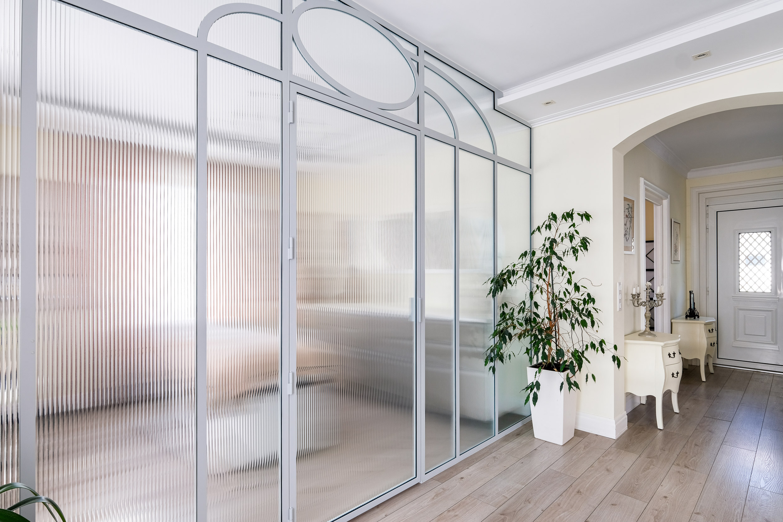 Le verre flûté assure intimité et discrétion, tout en laissant passer la lumière naturelle, créant une atmosphère douce et accueillante. La structure peinte en gris clair apporte légèreté et élégance, soulignant les lignes organiques et raffinées caractéristiques de l’Art Nouveau.
